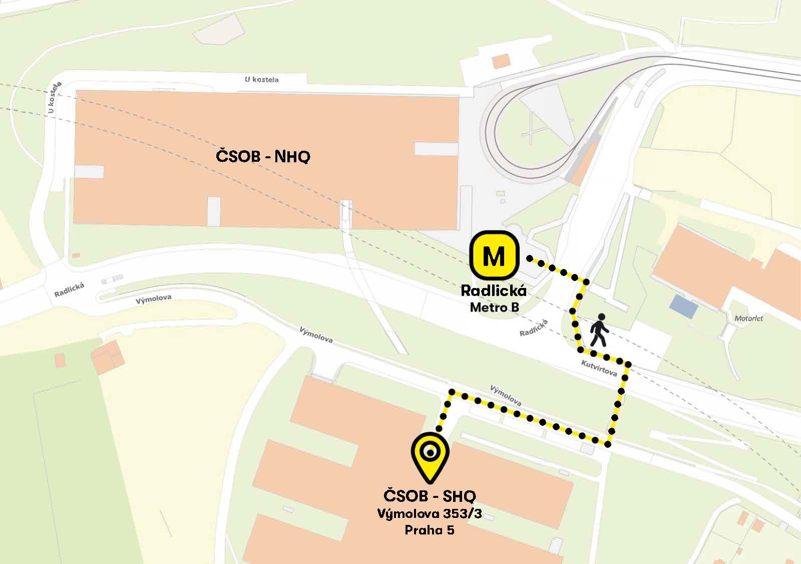 V mapě níže jsou vyznačeny dvě budovy ČSOB. Konference se koná v budově SHQ, která je ta vzdálenější od stanice metra.